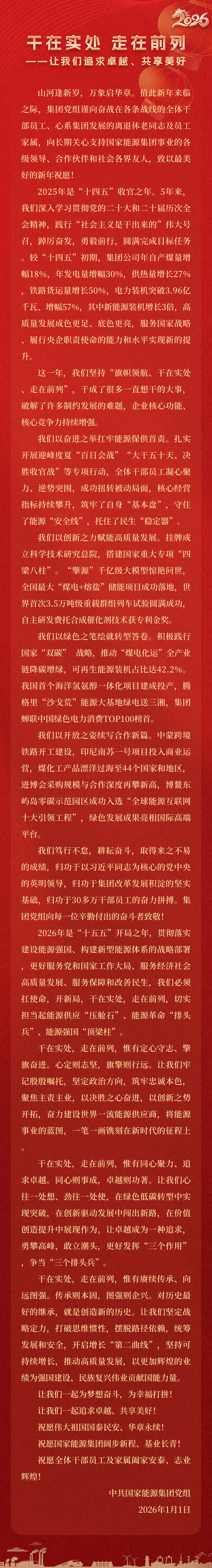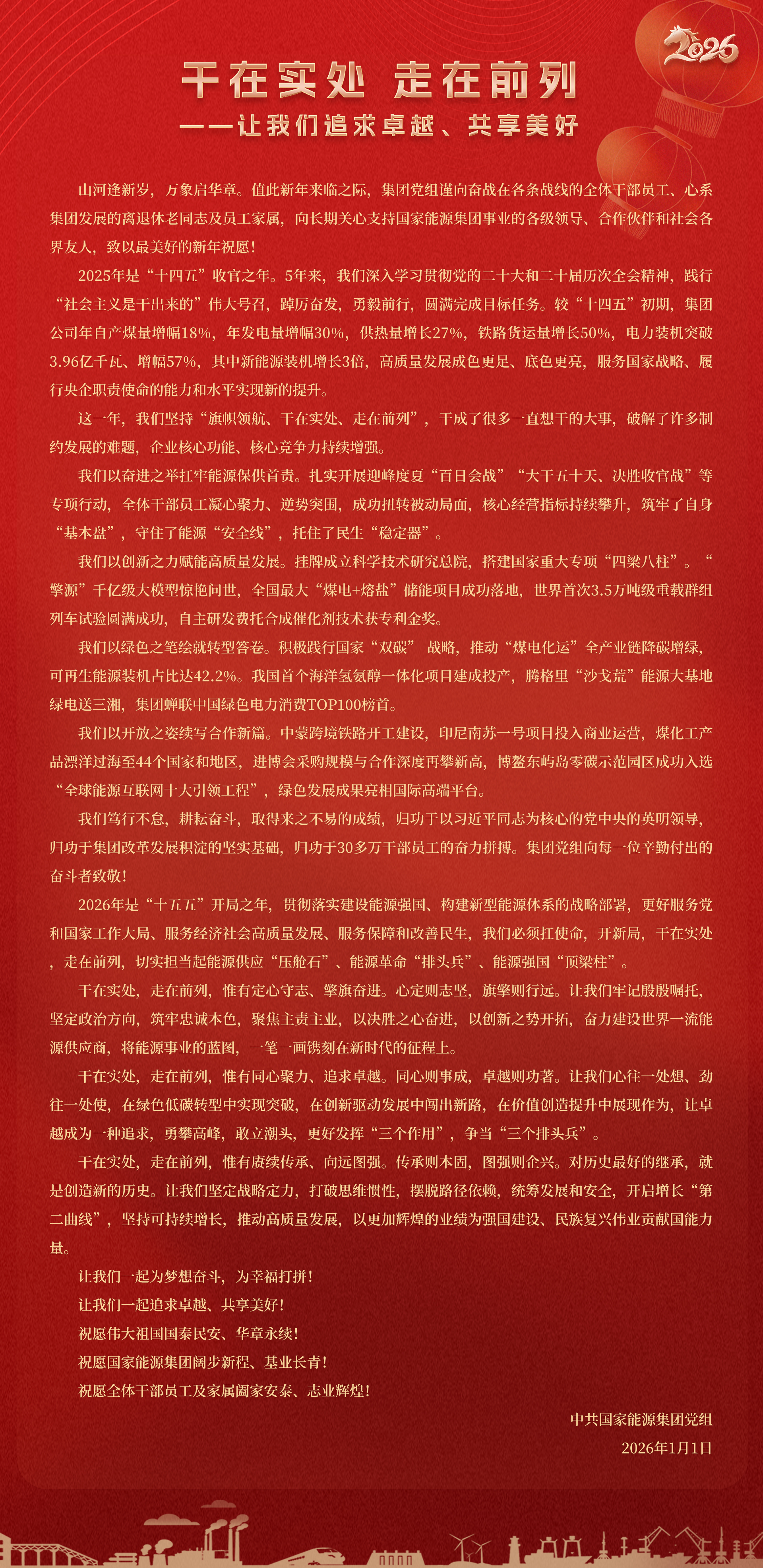 國家能源集團胸懷“國之大者”,增產增供、穩(wěn)價穩(wěn)市,積極服從服務國家戰(zhàn)略、保障國家能源安全、助力國民經(jīng)濟穩(wěn)增長,推動煤炭安全綠色智能、煤電清潔高效穩(wěn)定、現(xiàn)代煤化工高端多元低碳、運輸物流協(xié)同一體、新能源多元創(chuàng)新規(guī)模化發(fā)展,全力擔當能源強國頂梁柱,能源供應壓艙石,能源革命排頭兵。